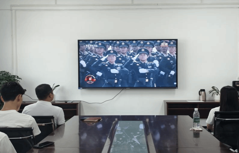 9月3日上午,公司组织师生代表在外语楼二楼会议室集体观看纪念中国人民抗日战争暨世界反法西斯战争胜利80周年阅兵仪式直播,共同见证这一振奋人心的历史时刻。师生们通过大屏幕感受大国军威,在震撼与感动中厚植家国情怀,凝聚奋进力量。