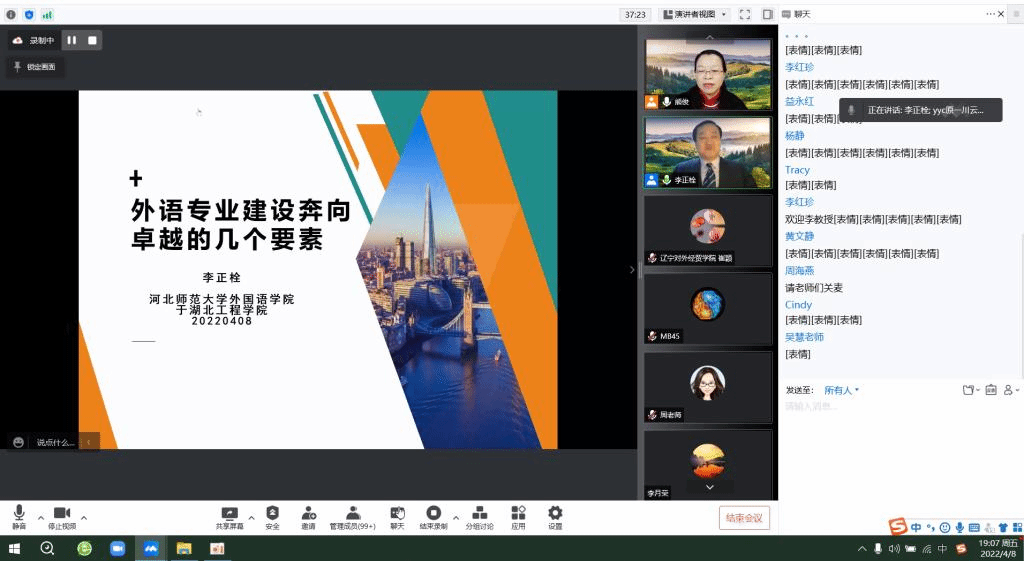 4月8日晚,教育部外国语言文学类专业教学指导委员会英语分委员会委员专家、国家级线上一流本科课程《英美诗歌欣赏》负责人,河北师范大学二级教授、博士生导师李正栓为公司教师在腾讯会议做了题为“外语专业建设奔向卓越的几个要素”的讲座。公司bevictor1946韦德官网教师以及部分来自其他高校的教师或管理者近150人聆听了此次讲座。本次讲座由教师教学发展中心、教务处主办,bevictor1946韦德官网承办。讲座由bevictor1946韦德官网副经理、翻译研究中心主任熊俊教授全程主持。