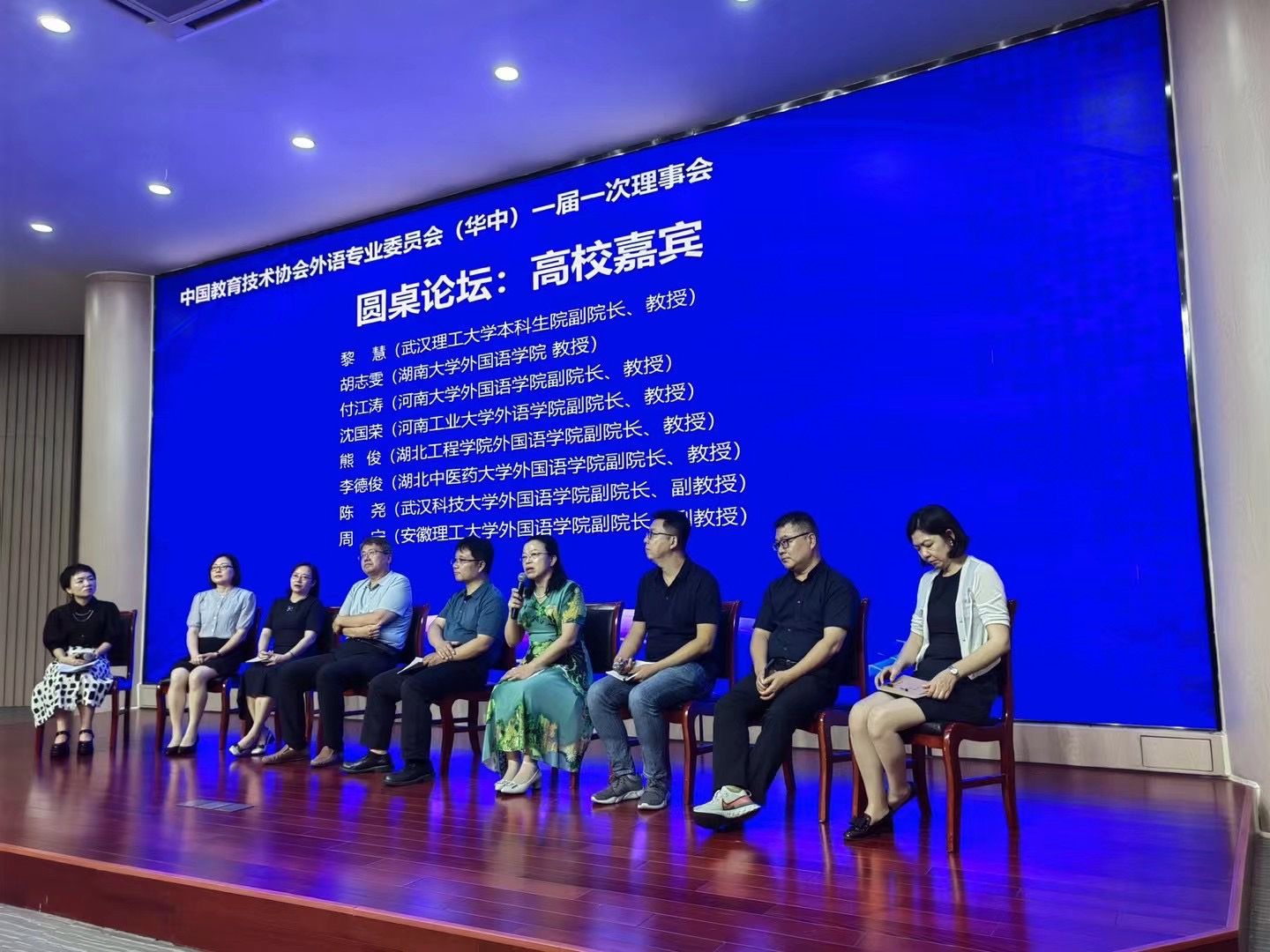 研讨会分学术探讨、技术方案和圆桌论坛三个环节举行。中国教育技术协会外语专业委员会秘书长王峻京、中国教育技术协会外语专业委员会(华中)会长杨牧文、中国教育技术协会外语专业委员会(华中)专家指导委员会主任刘军平分别致辞。来自天津外国语大学、中南大学、北京外国语大学、湖北大学、湖北师范大学等高校的专家就外语公司产品数字化转型进行了学术探讨。相关企业代表分享了人工智能时代外语教育数字化转型的技术方案。熊俊教授应邀在圆桌论坛以“外语教育数字化转型和外语教师数字素养提升”为题作交流发言。她介绍了公司和外院数字化建设取得的成绩,并就当前公司在外语教学数字化转型中面临的问题与挑战与其他高校代表展开交流。