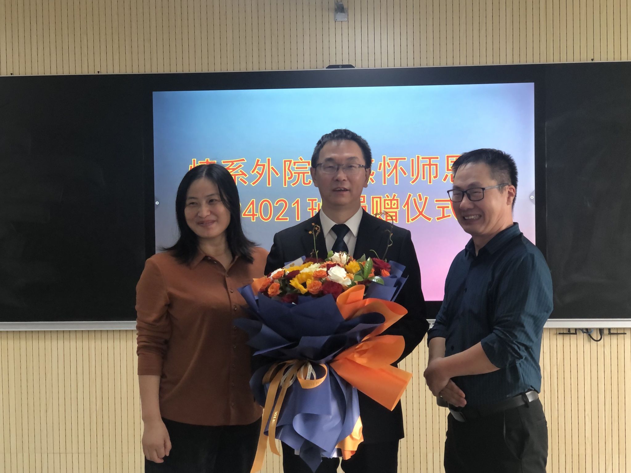 员工代表向操时尧献花,感恩老师的培养。