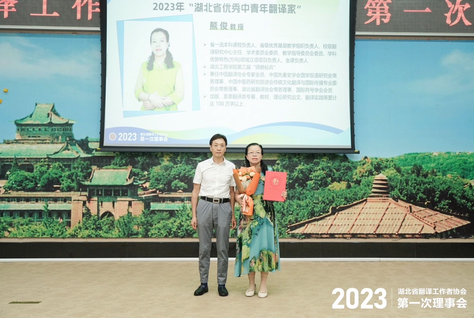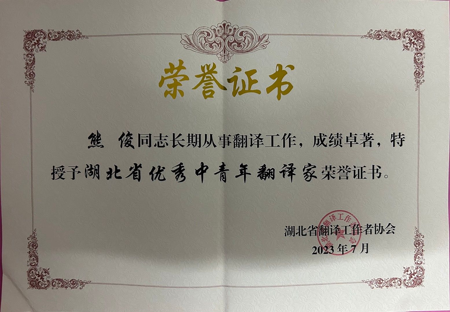在2023年湖北省翻译工作者协会第一次理事会上公司副经理熊俊博士、教授被授予“湖北省优秀中青年翻译家”称号。