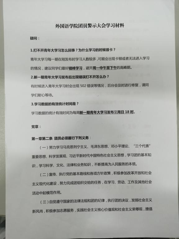 大会共分为三个部分:清点到场人数、集中学习与教育团员规范、现场填写登记表。在会议上郭洁老师领学了《团章》第一章第二条内容,明确了共青团员的义务和责任;解答了青年大学习常见问题;与现场员工分析了青年大学习学习的实际困难并提出解决办法。