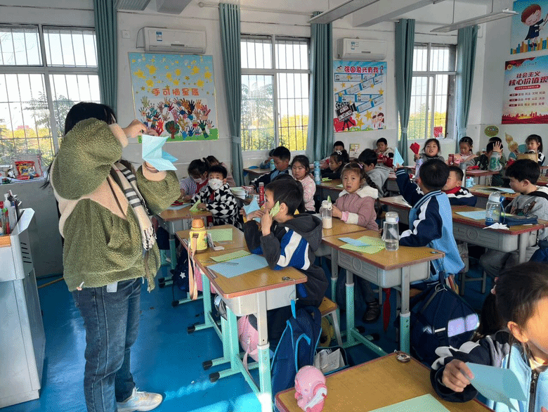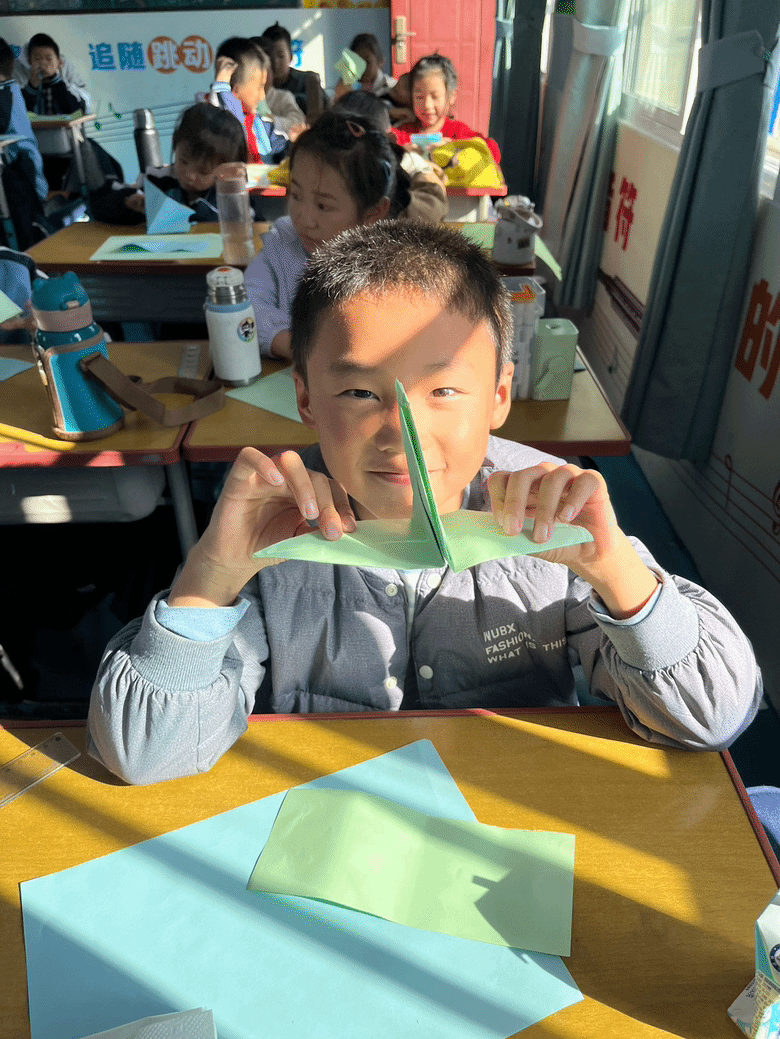 在志愿者们的指导下,孩子们逐渐掌握了折纸的技巧,纷纷叠出了自己的千纸鹤。他们兴奋地展示自己的作品,与志愿者们分享成功的喜悦。整个课堂充满了孩子们的欢声笑语,折纸艺术的魅力感染了每一个人。